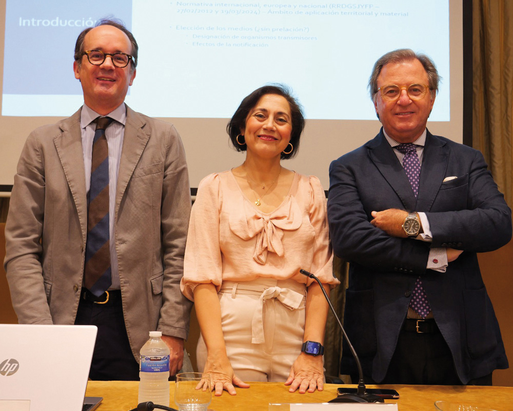 El 16 de octubre tuvo lugar la primera ponencia del ciclo 2025-26 de la Cátedra de Derecho Notarial Internacional y Comparado que comparten el Colegio Notarial de Andalucía y la Universidad Pablo de Olavide de Sevilla. El notario Juan Gómez-Riesco impartió la sesión La notificación internacional de documentos extrajudiciales por notario. En la mesa estuvo acompañado por Carmen Vela, vicesecretaria de la junta directiva del del colegio notarial, y Andrés Rodríguez Benot, director de la cátedra.