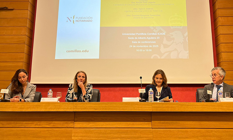 El 24 de noviembre tuvo lugar una nueva jornada de la Cátedra ICADE-Fundación Notariado, dedicado a la tokenización de valores negociables y acciones tras la nueva Ley de los Mercados de Valores. En la sesión participaron Reyes Palá, catedrática de Derecho Mercantil de la Universidad de Zaragoza; Yael Oaknín, CEO de Token City; y los notarios Cristina Requena y Manuel González-Meneses -moderador y director de la Cátedra-.