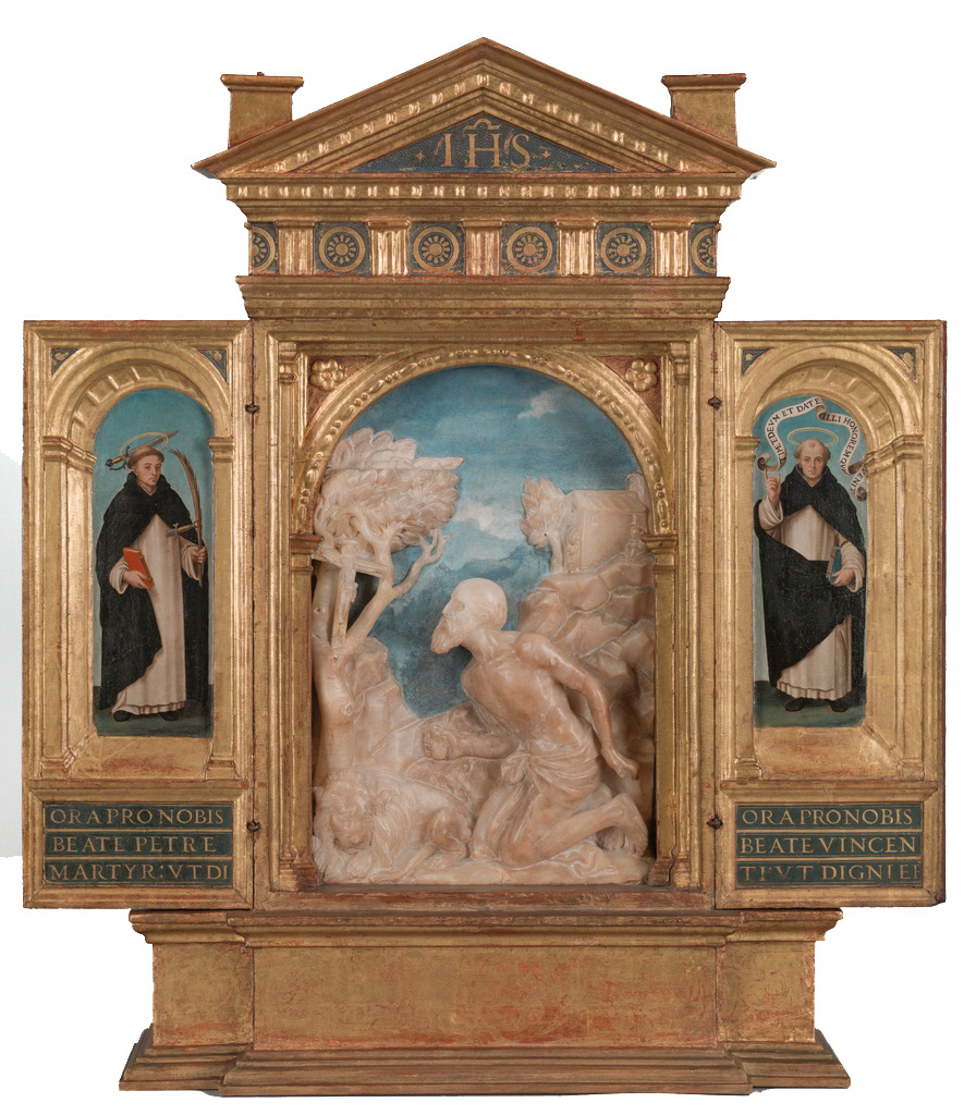 La realización de pequeñas placas de alabastro con escenas religiosas era una práctica frecuente que Forment empleó en otras ocasiones. Refinados coleccionistas apreciaban esas obras que, para asegurar su conservación y presentación como altares de sobremesa, se montaban en estructuras de madera. Este es el caso de este ejemplar en que está representado san Jerónimo en su retiro penitencial, un fondoso paisaje lleno de amenos detalles que originalmente estaban policromados y con resaltes dorados.