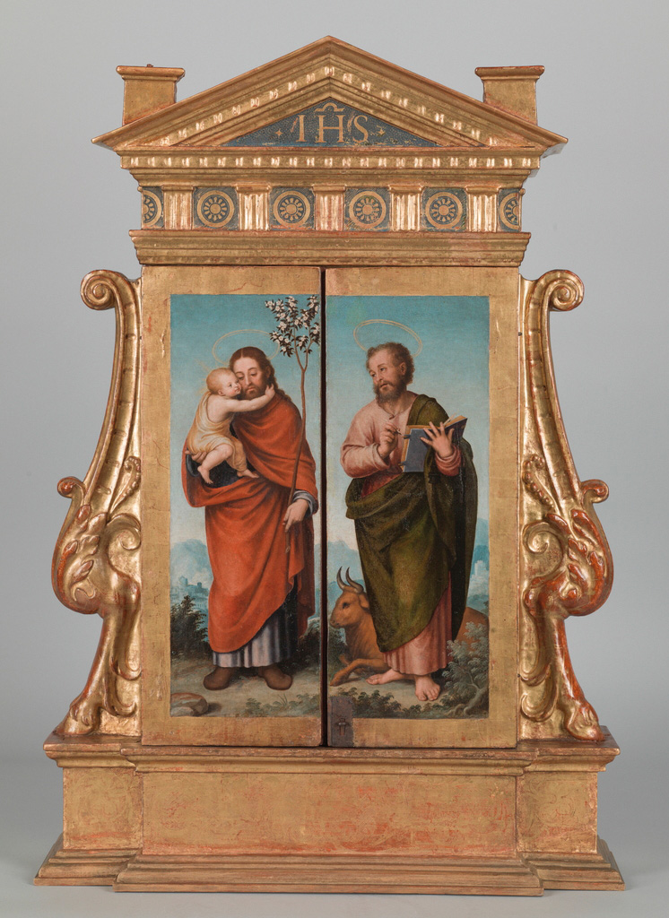 El alabastro se cobijó en una suerte de templete con basamento y rematado de frontón, trabajado en madera tallada y policromada y provisto de dos puertas batientes en la que incluyó la representación de cuatro santos. Con las puertas cerradas, se aprecia un paisaje con san José sosteniendo al Niño Jesús junto a San Lucas. En el interior pintó las imágenes de San Vicente Ferrer y San Pedro Mártir, dos figuras situadas en dos arcos exviados, un diseño pensado en la perspectiva de esos arcos con los batientes abiertos. Un alarde más de conocimientos de la arquitectura clásica.