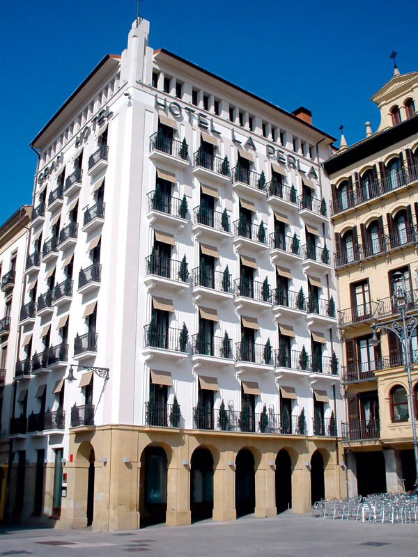 El Hotel la Perla, de vuelta a la Plaza del Castillo, está en la esquina más próxima al Ayuntamiento. No lo menciona el autor en el libro, pero lo visitaba habitualmente cuando iba a Pamplona por cariño hacia su propietaria, Ignacia Erro, y porque esta le facilitaba el contacto para tener entradas para los toros y le presentaba a los toreros que allí se hospedaban para que pudiese presenciar el ritual de la vestimenta de los diestros o el paso del encierro por la calle Estafeta. Cuentan que cuando Hemingway y su primera esposa, Hadley Richardson, llegaron a Pamplona en 1923 habían reservado en dicho hotel; pero al acceder a la recepción, y enterados del precio de la habitación, dijeron que no se lo podían permitir –parece que las crónicas periodísticas no daban para tanto– y la propia Ignacia Erro les ayudo a encontrar algo más asequible. Hoy, la habitación 201, que el escritor conoció como la 217 –los cambios de numeración son fruto de las reformas del año 2005–, se mantiene tal cual la vivió el ya reconocido autor durante los sanfermines de 1953 y 1959, con el mismo mobiliario y la misma decoración. Se conoce que el éxito de Fiesta, el de obras posteriores que le situaron en la nómina de los grandes escritores de su época y la concesión del Nobel de Literatura (1954) le permitieron pagar, esta vez sí, la estancia.