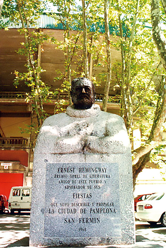 “La plaza de toros, alta y blanca; a la luz del sol, parecía hecha de hormigón”. Lo cuenta Jake Barnes, que es el narrador de la historia y alter ego de Hemingway, cuando en el capítulo X los excursionistas llegan a Pamplona. El coso pamplonés, de estilo renacentista, se inauguró en julio de 1922 y, por tanto, es el que vio el autor el año después, en su primera visita, y siguientes. Al principio del paseo que lleva el nombre del escritor, justo a la entrada del callejón por el que los toros de los encierros acceden a la plaza, está un monumento conmemorativo con un busto que le representa –cara ancha, barba poblada, jersey de cuello alto– instalado en 1967, seis años después de su muerte.