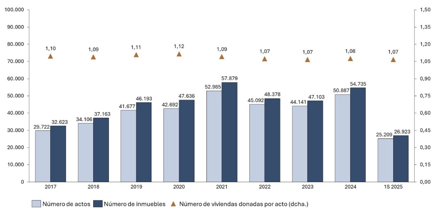 Dentro de las donaciones, el número de actos que contiene al menos una vivienda ha crecido un notable 71,2% entre 2017 y 2024. En el primer semestre de 2025 las donaciones totales aumentaron un 9,8% (al pasar de 96.368 en el primer semestre de 2024 a las 105.851 actuales), mientras que las donaciones que contienen viviendas crecieron un 1,7% (desde las 24.784 en el primer semestre de 2024 hasta las 25.209 de este año).