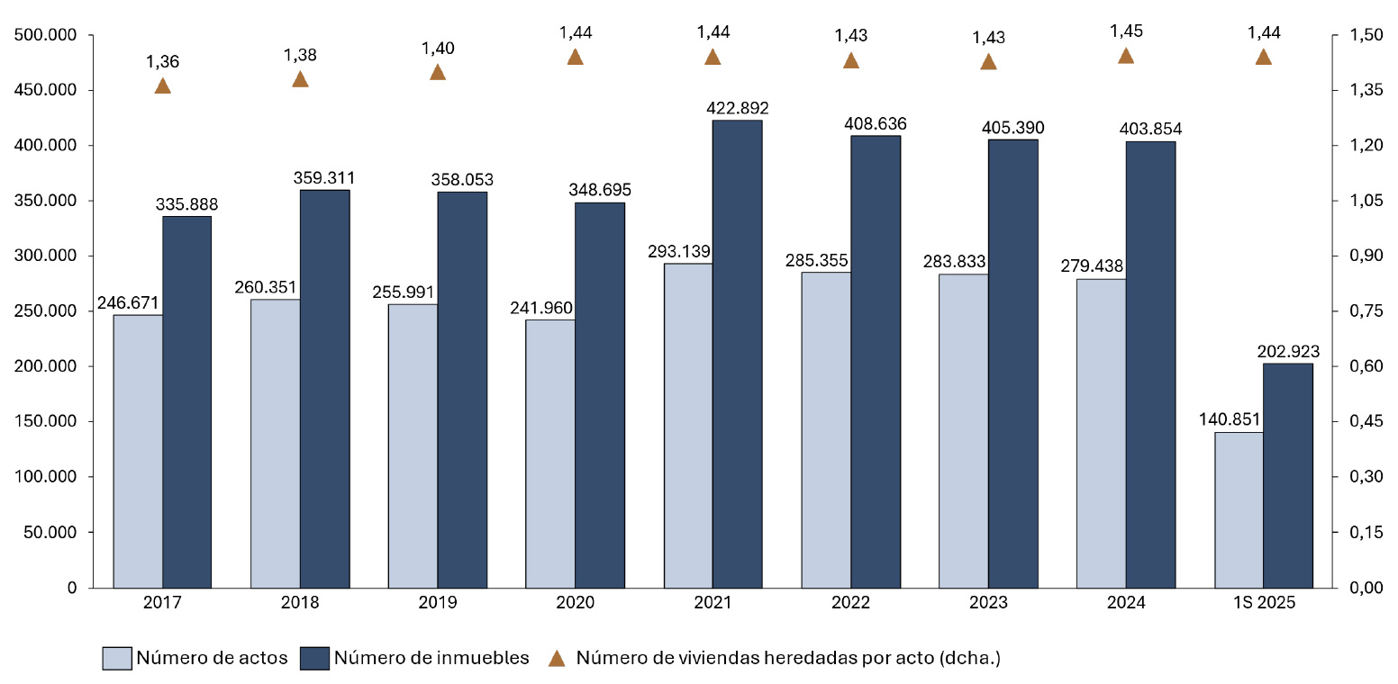 Por su parte, las herencias aceptadas que incluían vivienda también fueron significativas. El número de actos de herencia que incluyen inmuebles ha mostrado una evolución oscilante: de 246.671 en 2017 a 279.438 en 2024, con un máximo en 2021 (293.139 actos) y una cifra de 140.851 en el primer semestre de 2025.