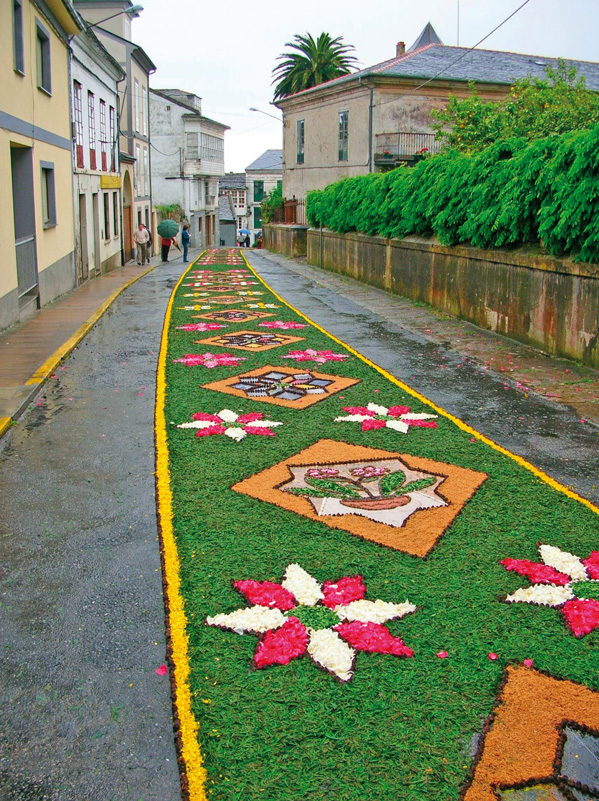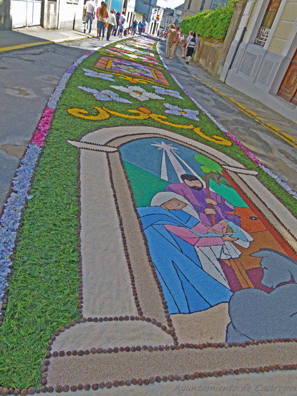 El trabajo de engalanar los suelos lleva meses de preparación y en él participan todos los castropolenses: en el dibujo de las figuras, la adaptación del diseño a las medidas de la calle y la laboriosa realización a base de flores –claro–, semillas, conchas, cantos y hasta posos de café. El objetivo es que el domingo posterior a la festividad del Corpus Christi, los peques disfruten de un día especial para ellos; y que los no tan peques lo hagan también con el orgullo de un trabajo artesanal bien hecho o, para los visitantes, de una eclosión de colores y texturas tapizando adoquines y asfaltos.